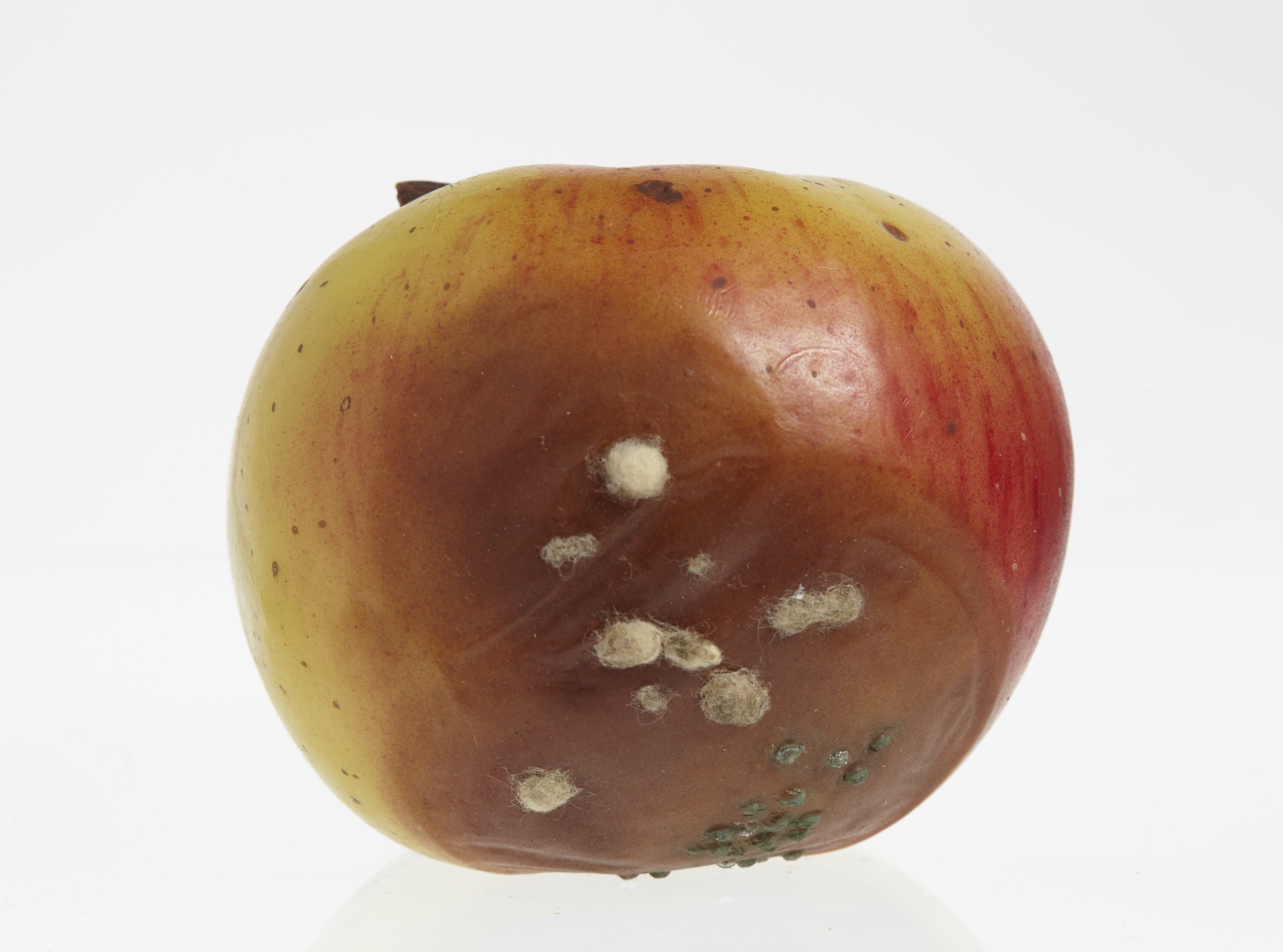 Wax model of an apple with a brown stem, painted yellow and green. The apple has a large brown area containing fuzzy growths and green spots. There are also small brown spots across the skin of the apple.