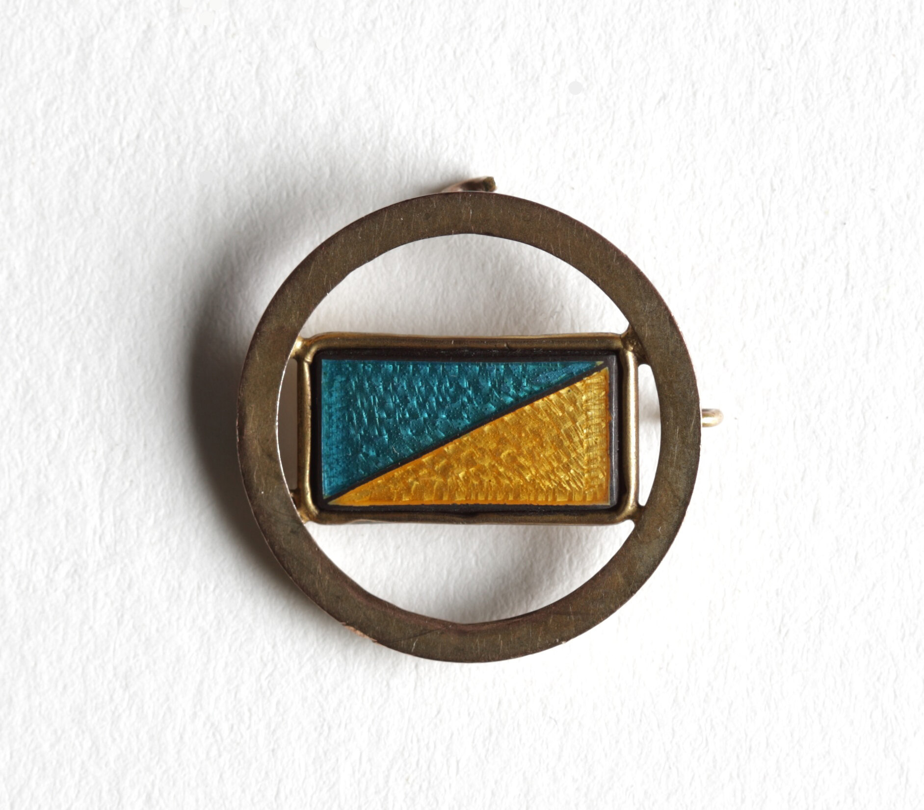Gold ring surrounding a rectangular plate divided diagonally by blue and yellow enamel. Some damage evident on fixing loops.