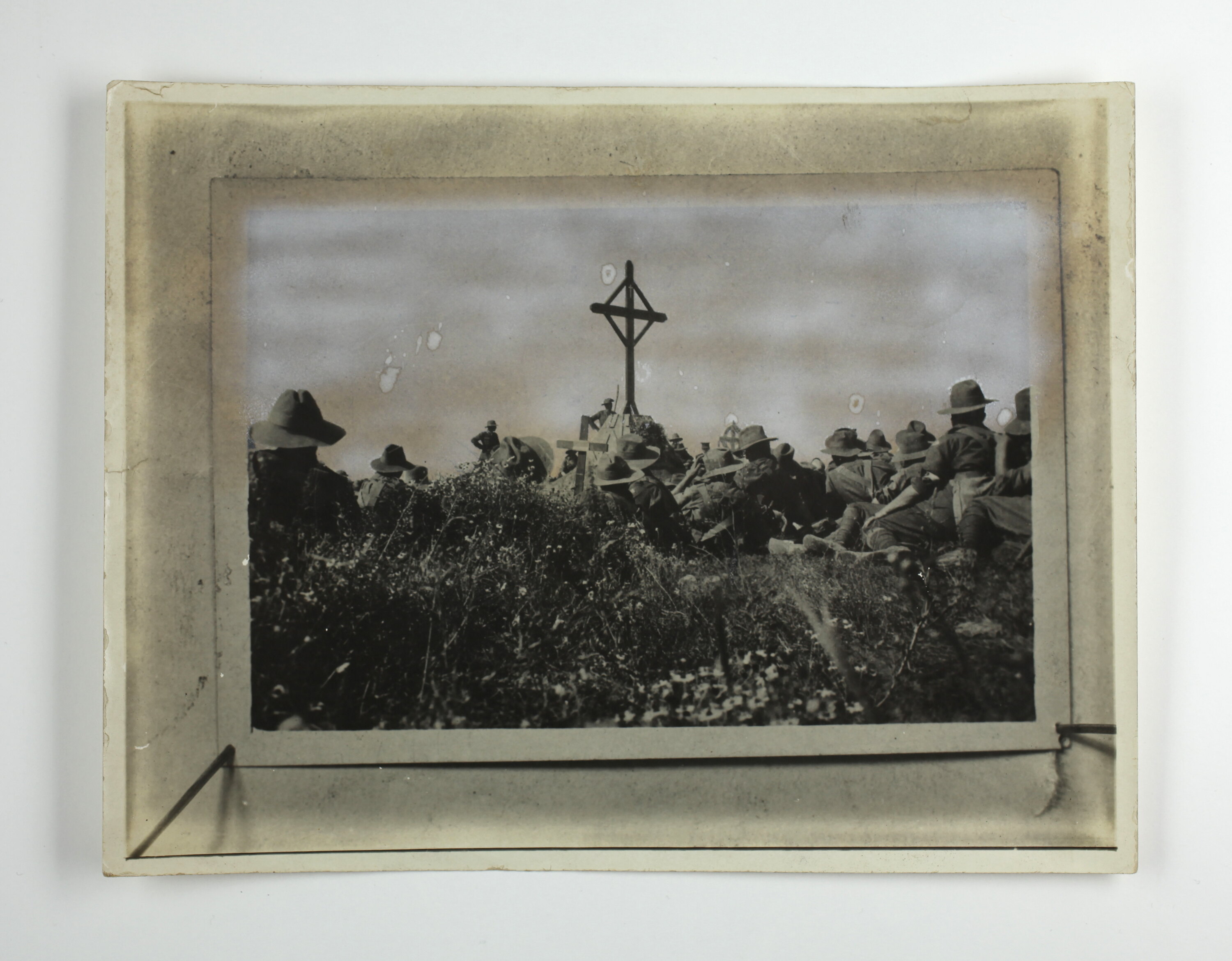 Photograph adhered to paper, and enlargement showing pins that held the original during reproduction, depicting Australian servicemen of the 24th Battalion gathered at the dedication of a memorial at Pozieres, France, in August 1917.