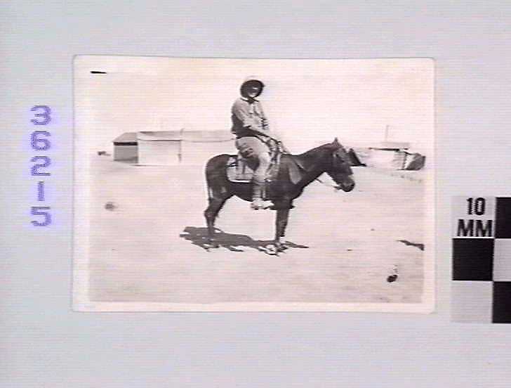 Australian serviceman Lieutenant Dawson, 24th Battalion, A. I. F., Egypt circa 1915. snapshot, in shorts wearing tropical helmet and mounted on donkey.