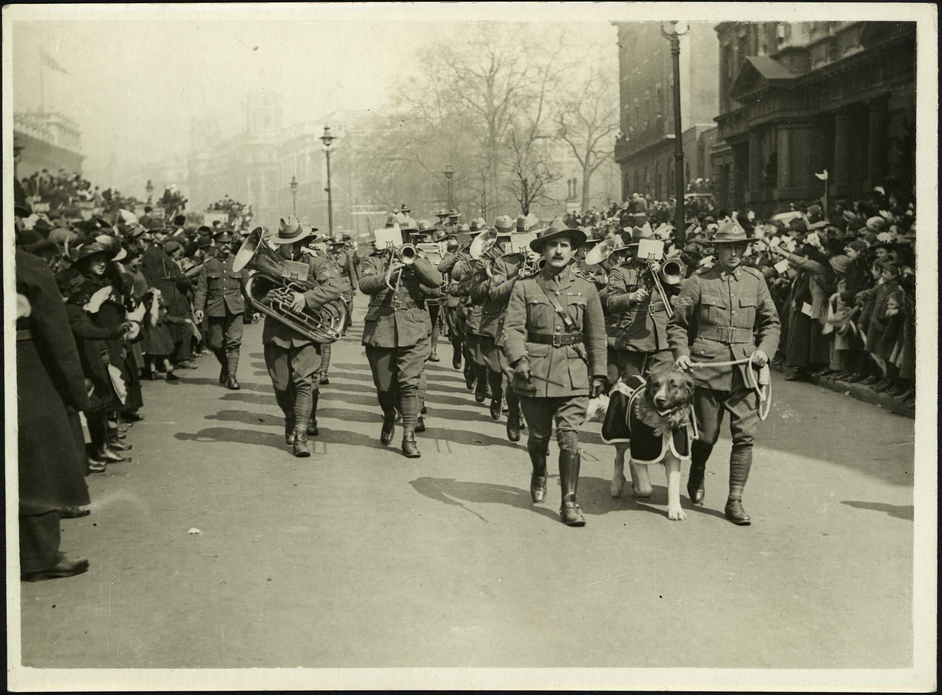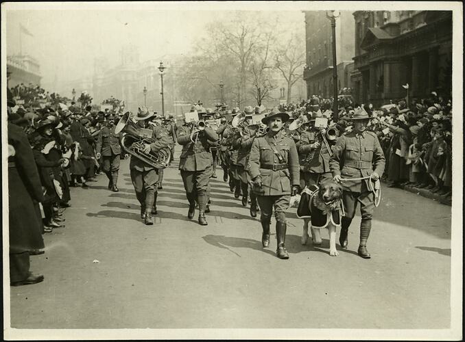 Printed on back top: 'W.113a. / Anzac Day In London. All Honor To / Them. / Their band was led by the mascot / of the Regiment.' Printed on back centre: 'THESE PICTURES ARE ISSUED AND CONTROLLED / BY THE / PHOTOGRAPHIC DISTRIBUTION Co. / 234, HIGH HOLBORN, LONDON W.C.1. / TO WHOM ALL CHEQUES AND COMMUNICATIONS / MUST BE ADDRESSED.' Printed on back bottom: 'COPYRIGHT / NEWSPAPER ILLUSTRATIONS, LTD / 161A, STRAND, W.C.2. / 'PHONE GERRARD 8808.'