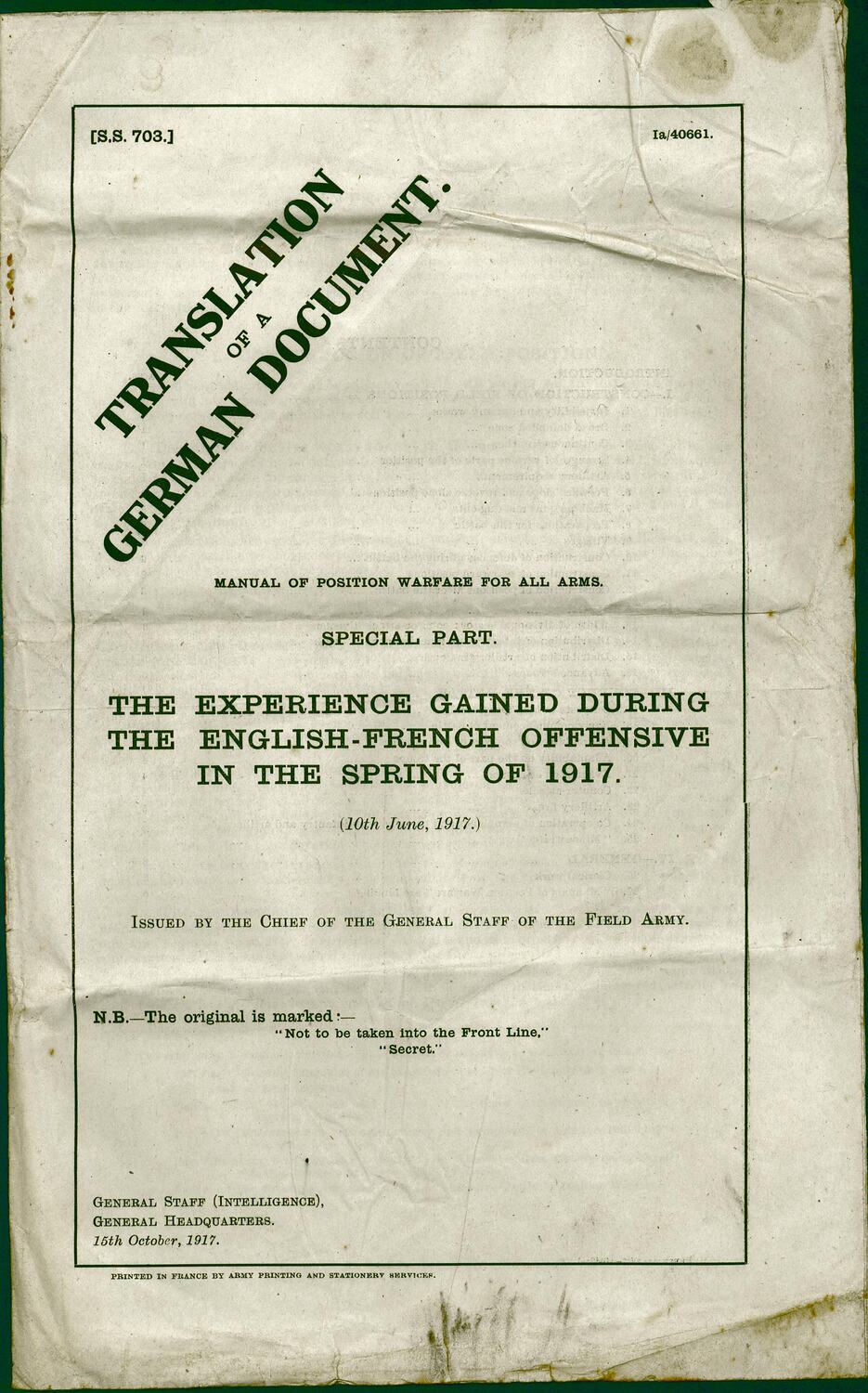 Leaflet titled 'Manual of Position Warfare for All Arms. Special Part. The Experience Gained During the English - French Offensive in the Spring of 1917'. The leaflet is a translation of a German document, printed in France by Army Printing and Stationery Services (S.S. 703) IA/40661. It was issued by General Staff (Intelligence), General Headquarters, 15 Oct 1917.