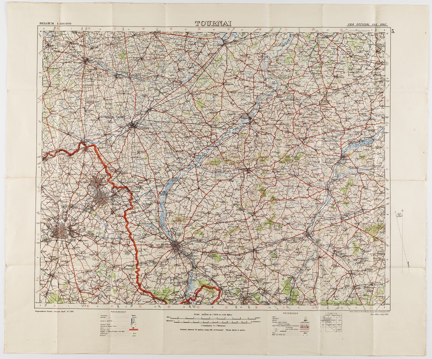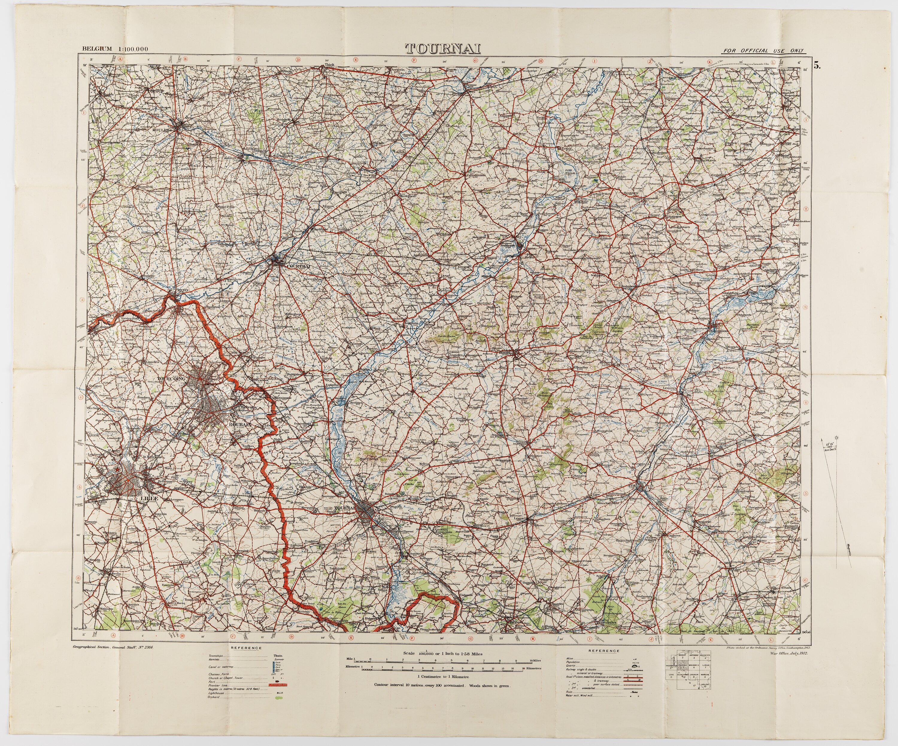 Printed on upper front: 'BELGIUM 1:100,000 / TOURNAI / FOR OFFICIAL USE ONLY '. Lower front: 'Geographical Section, General Staff, No. 2364 / Photo etched at the Ordnance Survey Office, Southampton, 1912 / War Office, July, 1912.' On back (serving as cover when folded): 'TOURNAI 5 / BELGIUM / Scale 1/100,000'.
