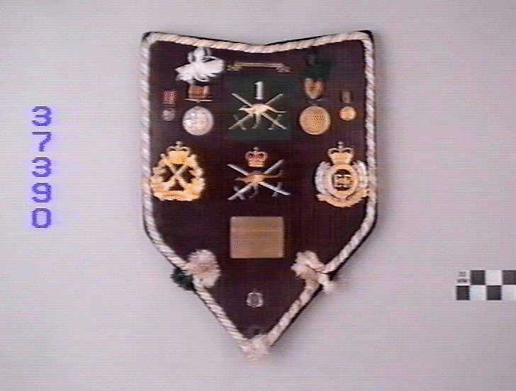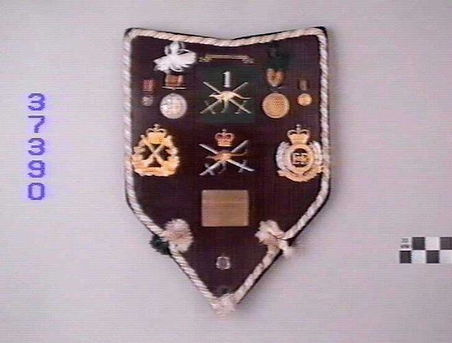 Wooden plaque of shield shape, with rope edge decoration, to which have been attached medals and badges.
