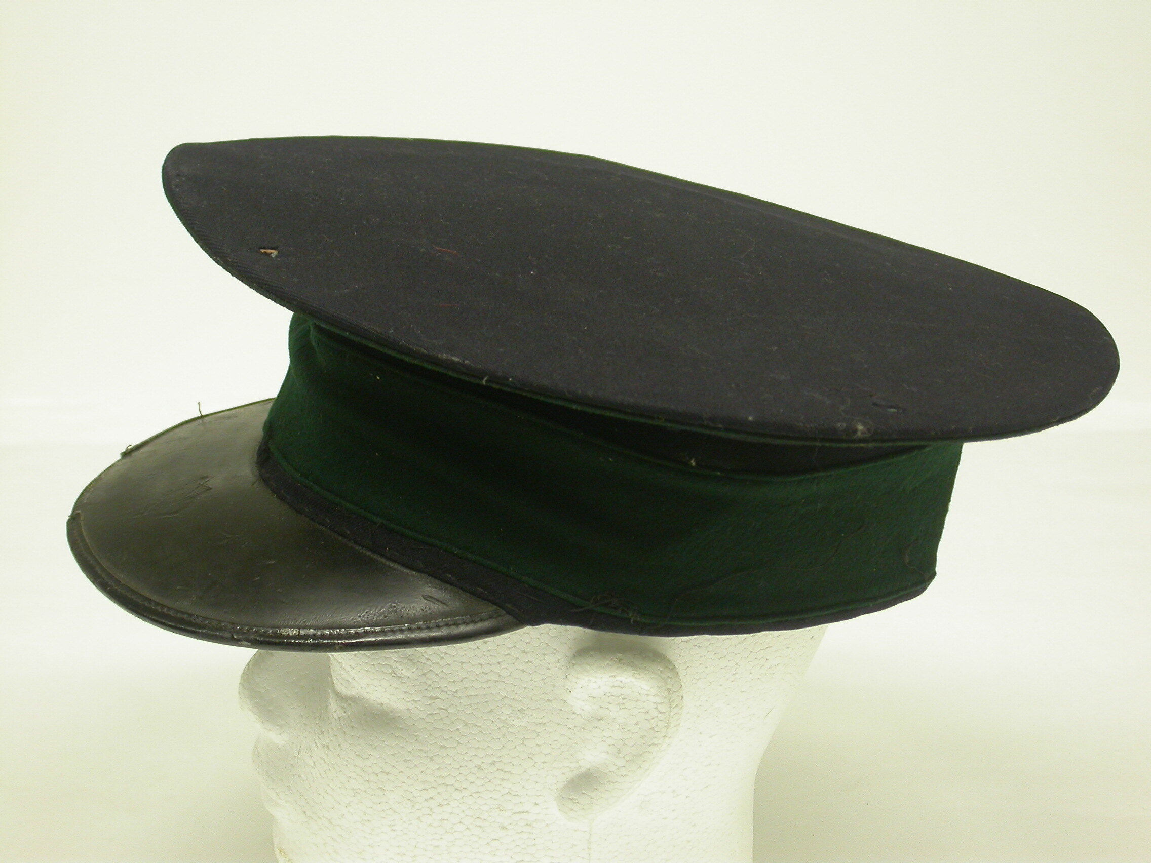 Peaked navy blue serge cap. Green band around base of crown and a leather peak. Green piping on crown. Badly damaged by insect activity, and lining very worn.