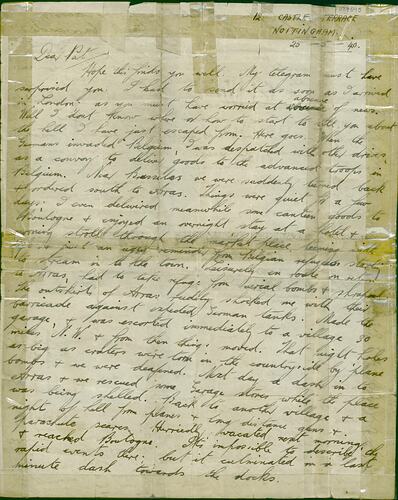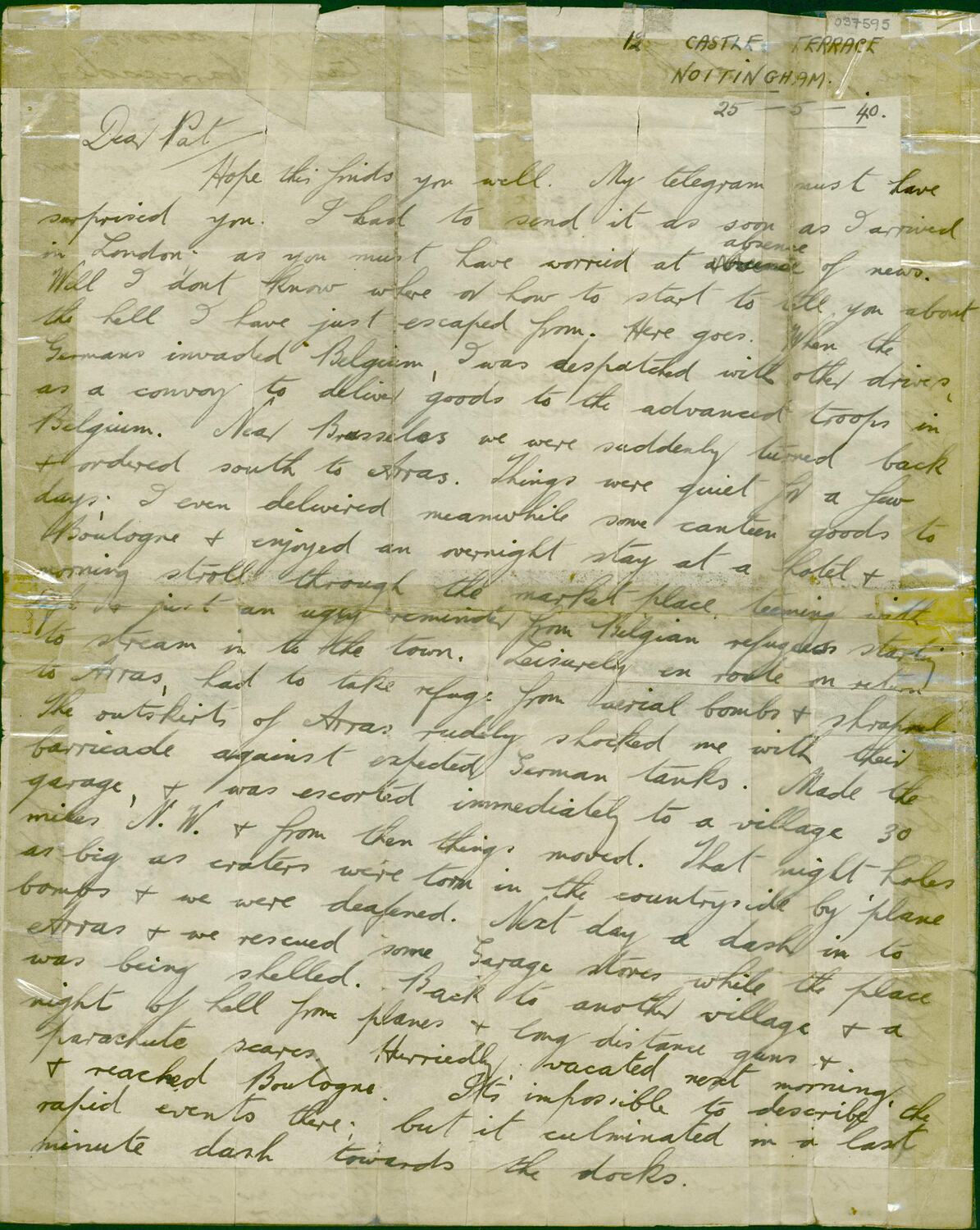 Letter dated 25 May 1940, written by Harry Collins to 'Pet' (referred to as Pet Marshal in ST 037596) describing his experience as a driver for the army during the Battle of France. The letter includes an account of Collins' escape from Bolougne to Dover (he escaped on the D33) during the Dunkirk evacuation.