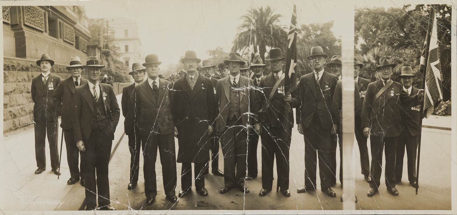 Panoramic photograph, black and white, of marchers on Anzac Day, probably taken in the 1930s. The men depicted are probably World War I veterans. They are walking past the south side of the (now) Old Treasury building, Melbourne, alongside the Treasury Gardens. On Anzac Day in 1936 it was decided to assemble the march in Treasury Gardens, rather than just march past the Treasury building. It was also decided that year to march 20 abreast, rather than 12 as in previous years, to alleviate the wait for veterans.