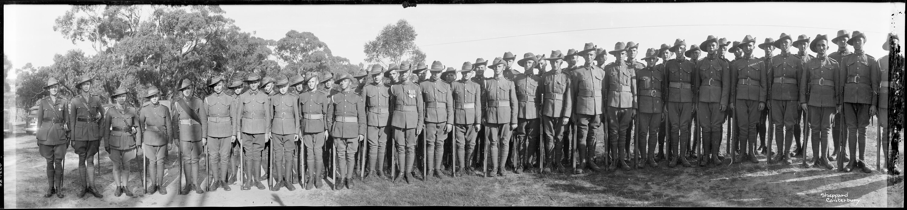 Australian soldiers in uniform, wearing slough hats, with gum trees behind.
