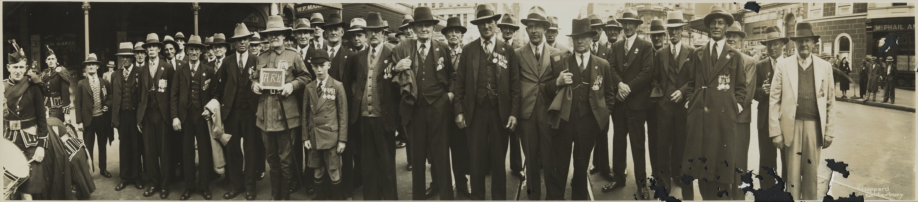 Panoramic photograph, black and white, of Anzac Day marchers, probably taken in the 1930s. The men depicted are probably World War I veterans.