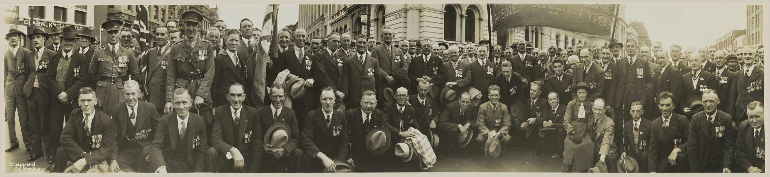 Panoramic photograph, black and white, of group of men, wearing or holding hats. The front row are squatting or sitting. Public buildings are visible behind the group.