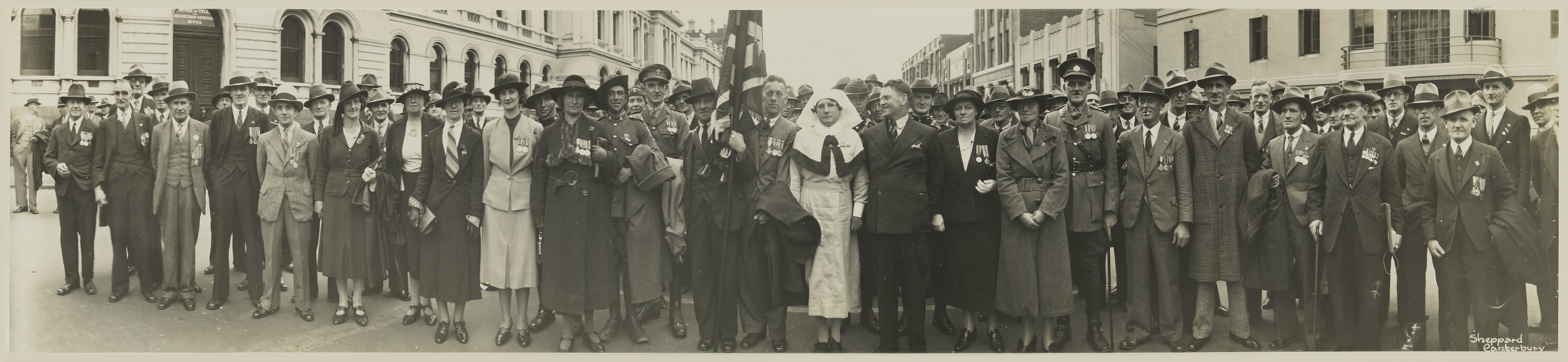 Panoramic photograph, black and white, of marchers on Anzac Day, probably taken in the 1930s. The men and women depicted are probably World War I veterans.