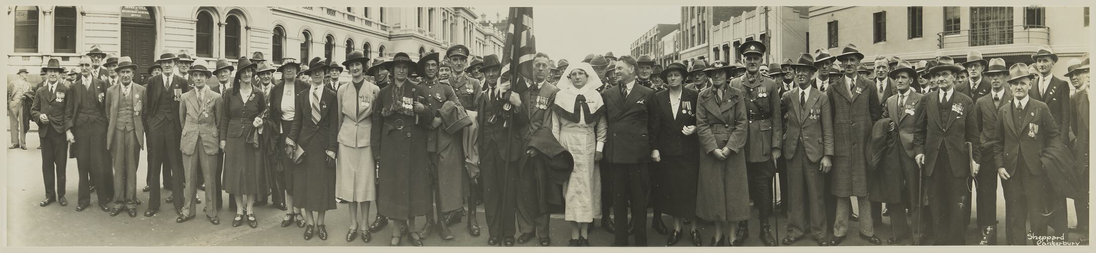 Panoramic photograph, black and white, of group of men and women in a city street. A woman in the centre wears a nurse's uniform. Public buildings are visible behind the group.