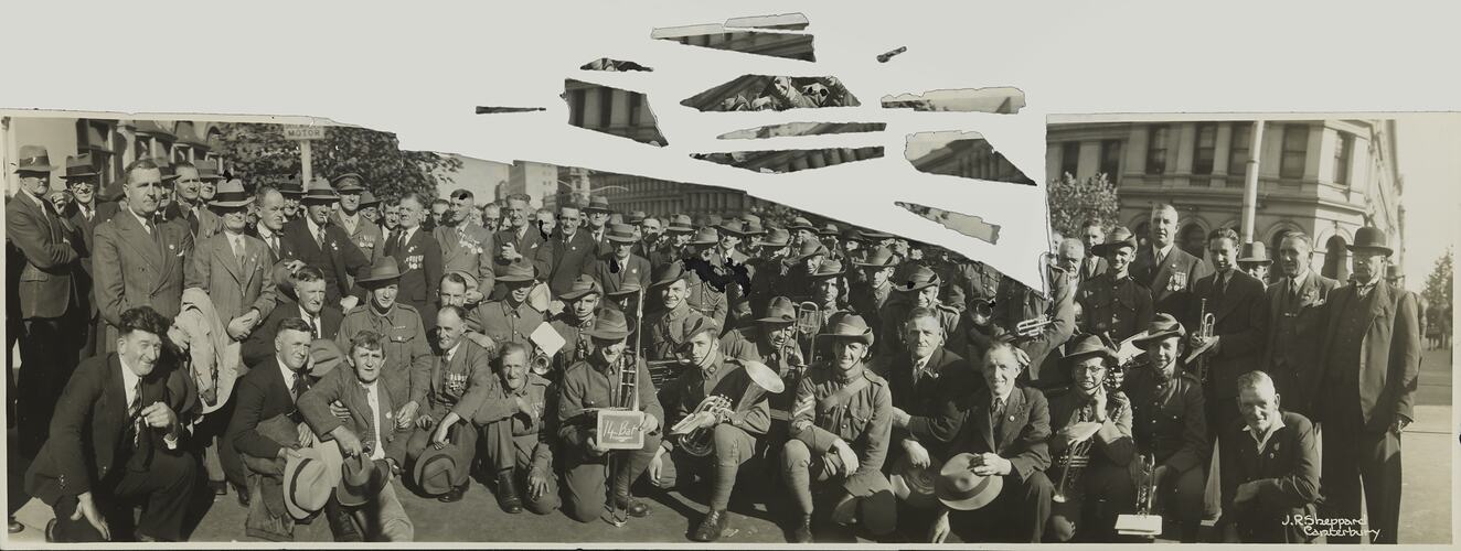Panoramic photograph, black and white, of Anzac Day marchers, probably taken in the 1930s. The men depicted are veterans of the 14th Battalion.