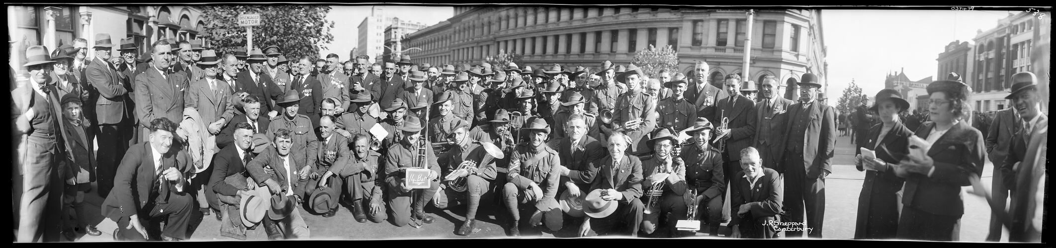 Panoramic negative of Anzac Day marchers in Melbourne. Men dressed in suits and uniform, some hold musical instruments.