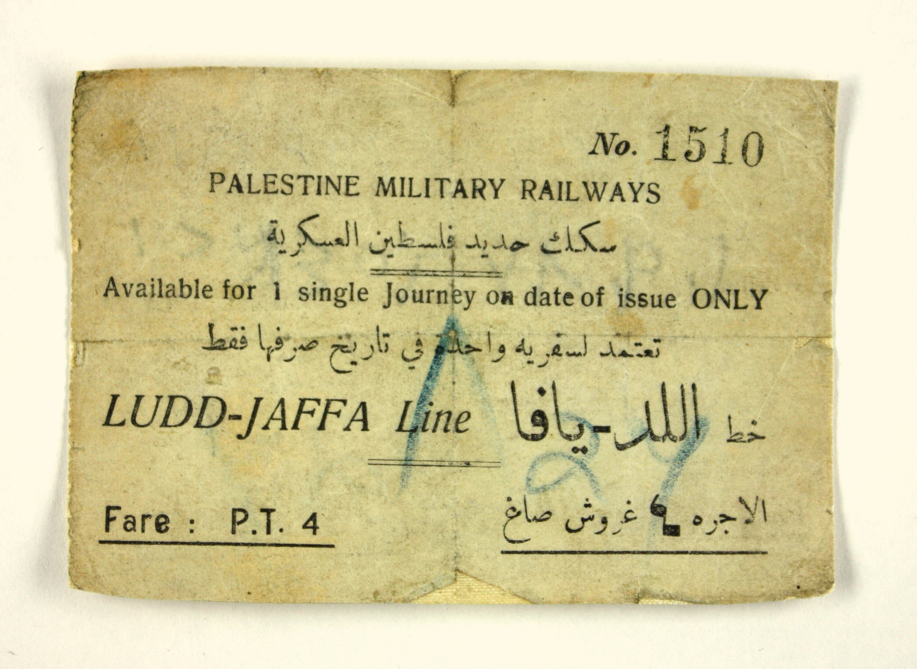 PALESTINE MILITARY RAILWAYS TRAVEL PASS, FOR ONE JOURNEY ONLY, LUDD-JAFFA LINE. NUMBERED "NO. 1510". PRINTED IN ENGLISH AND ARABIC. ISSUED TO L CPL. HARRY COLLINS.