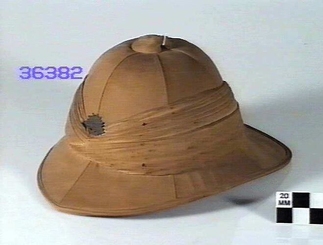 Khaki-covered helmet, linen puggaree,with rising sun badge at front, green material lining under brim leather lining band and chinstrap.