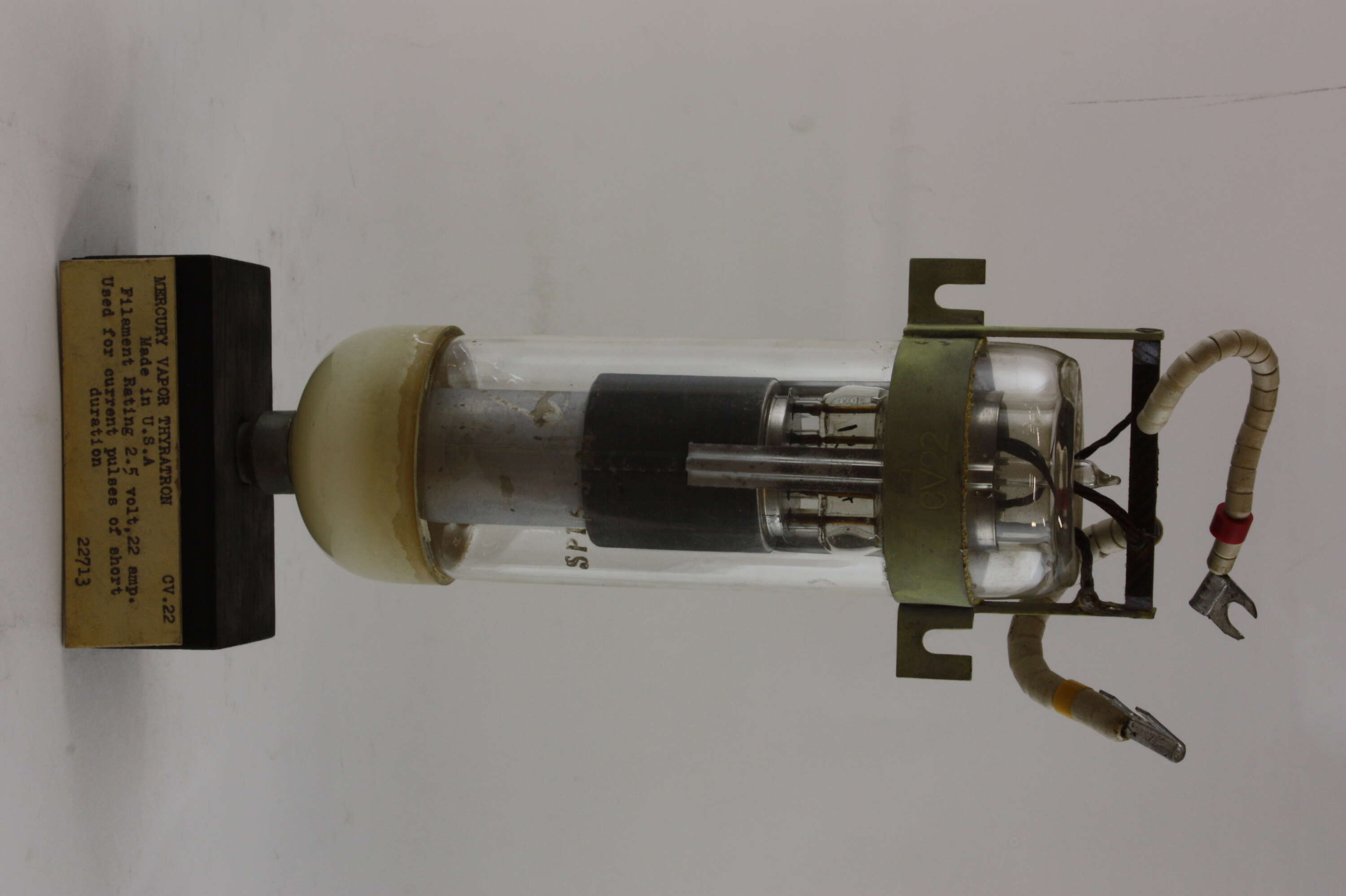 CV22 thyratron, mercury vapour. Made in England by an unknown Maker. Filament 2.5 volts at 22 amps; anode 20 kilovolts peak 65 amps. Used for generating current pulses, of short duration, in radar. Two CV22 thyratrons were used to generate a 40A/25kV 1µs pulse at 400pps for the GL3 S-band radar.