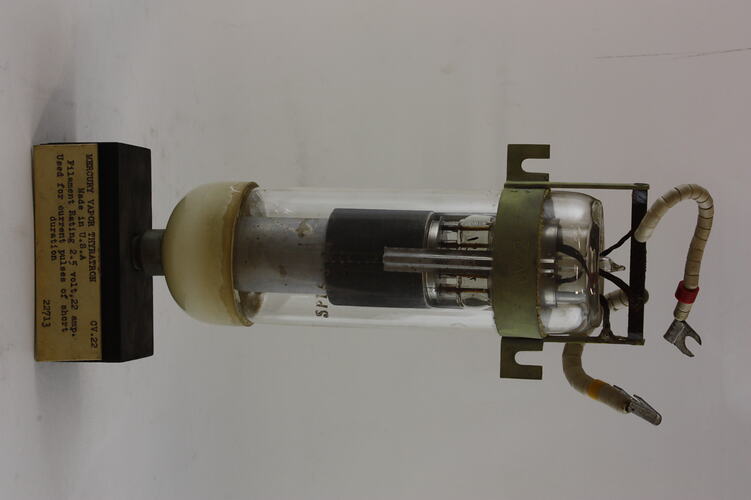 Cylindrical bulb with top cap but no base as such. Support clamped around base designed to mount valve on a panel. Mounted upside down on display block. Flying leads for filament insulated by ceramic fishbone beads. The two coloured beads indicate the grid connection (yellow) and one end of the filament (red), the other end of the filament is connected to the mounting bracket. Material between clamp and glass may be woven asbestos.