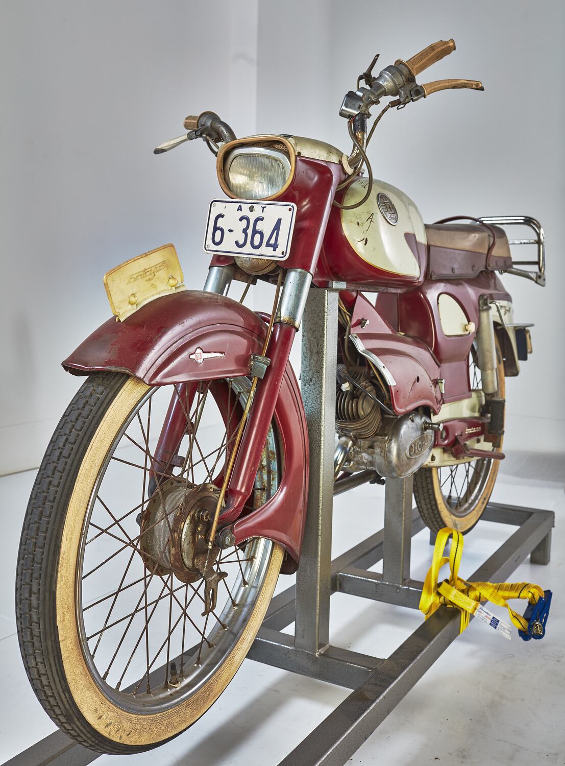 This stylish maroon and white Batavus 'Super Sport' is a lightweight machine typical of the type of motor cycle developed by several European manufacturers after World War II. Styling became an important feature in the sales success of these cheap lightweight forms of transport. The Batavus company was established in Holland in 1911 and initially made a range of motor cycles of up to 198 cc using a variety of Villiers, Sachs & Ilo engines, before developing a specialist reputation for mopeds.