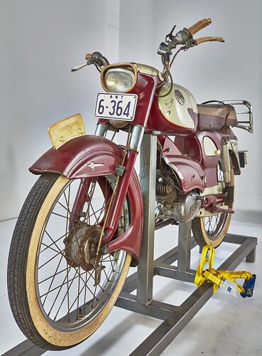 This G50 model with pedals was acquired with a range of accessories used by the original owner including a tool bag with tools, a long leather riding coat, leather riding mittens, a helmet and three Dutch registration plates relating to its use in the Netherlands between 1966 and 1970. The owner brought this Batavus with him to Australia when he emigrated in about 1971 and subsequently used it for about 10 years in the ACT before donating it to the Museum. It is believed to have been built in about 1960. It carries ACT registration number 6-364.