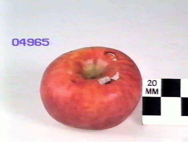 Wax model of an apple, painted red and yellow.