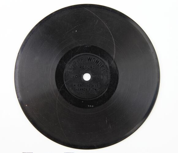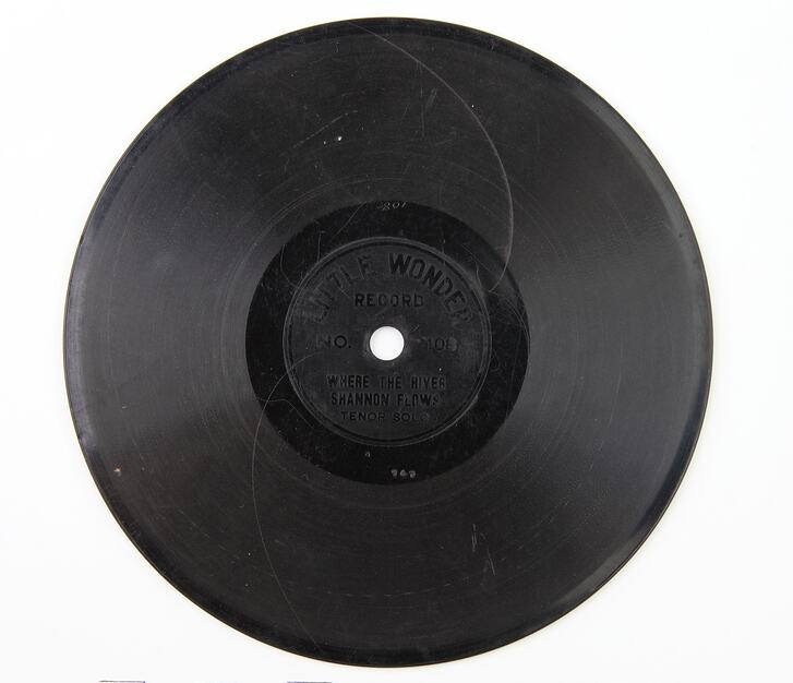 Little Wonder recording of 'Where the River Shannon flows', the artist is unknown. The disc is a single sided 5½ inch shellac lateral cut engraving, manufactured by the Little Wonder Company.