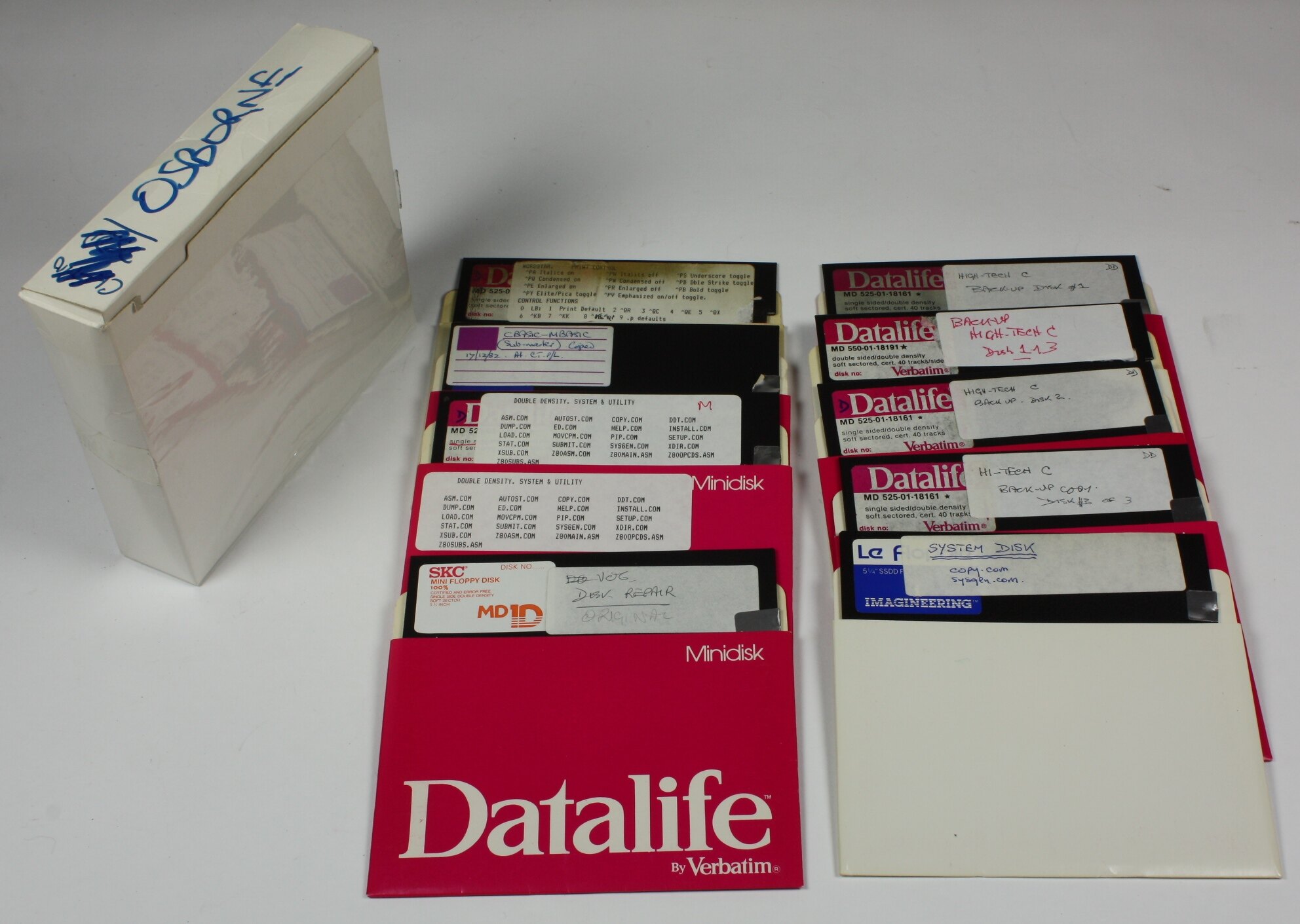 Handwritten on top of box: OSBORNE The disks carry various printed and handwritten labels indicating their contents.