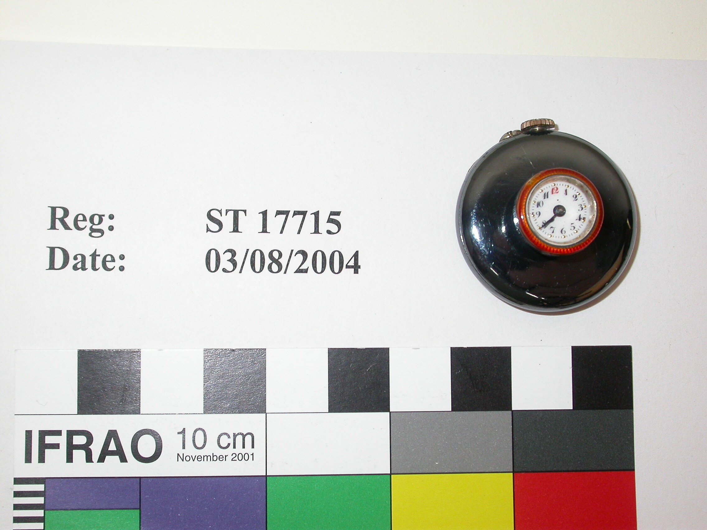 Swiss button hole watch, gunmetal, circa 1900. Shaped like a collar stud with movement in disc base and dial set forward like head of stud.