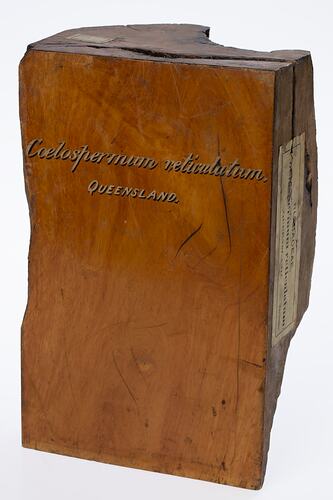 Front, painted, gold and black: 'Coelospermum / reticulatum. / QUEENSLAND.' Sticker, printed, black ink: 'RUBIACEAE / Coelospermum reticulatum. / QUEENSLAND. Benth'