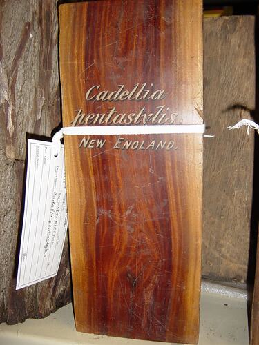 Prepared for exhibition purposes in the Industrial & Technological Museum in 1885. It features a hand painting of the species by Miss May Vale (later Mrs. Gilfillan). Exhibited at the following exhibitions: 1886 Indian and Colonial Exhibition, London; 1887 Jubilee Exhibition, Adelaide; 1888-89 Centennial International Exhibition, Melbourne; 1889 Exposition Universelle, Paris.