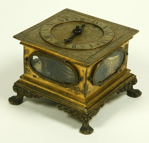 Square gilded brass case on four feet. Horizontal dial with brass chapter ring and single hand. Floral motifs in centre, and cherubs in spandrels. Door beneath dial contains striking bell. Spring wound; verge escapement.