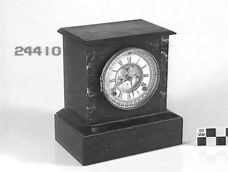 Mantel clock, rectangular marble case, made by Ansonia Clock Co, New York, circa 1890.