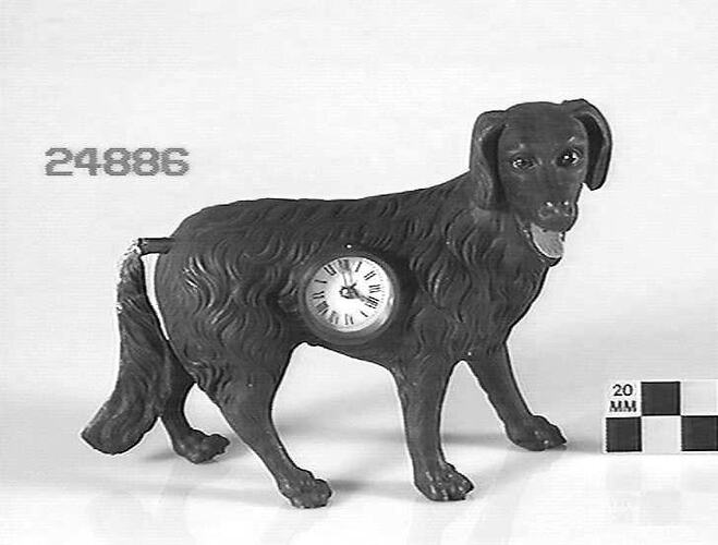 Dog clock, made by Gustav Becker, Germany. The case is in the form of a dog. The tail and tongue are counterpoised on the pallet arbor and serve as a pendulum. The tail wags and the tongue pants.