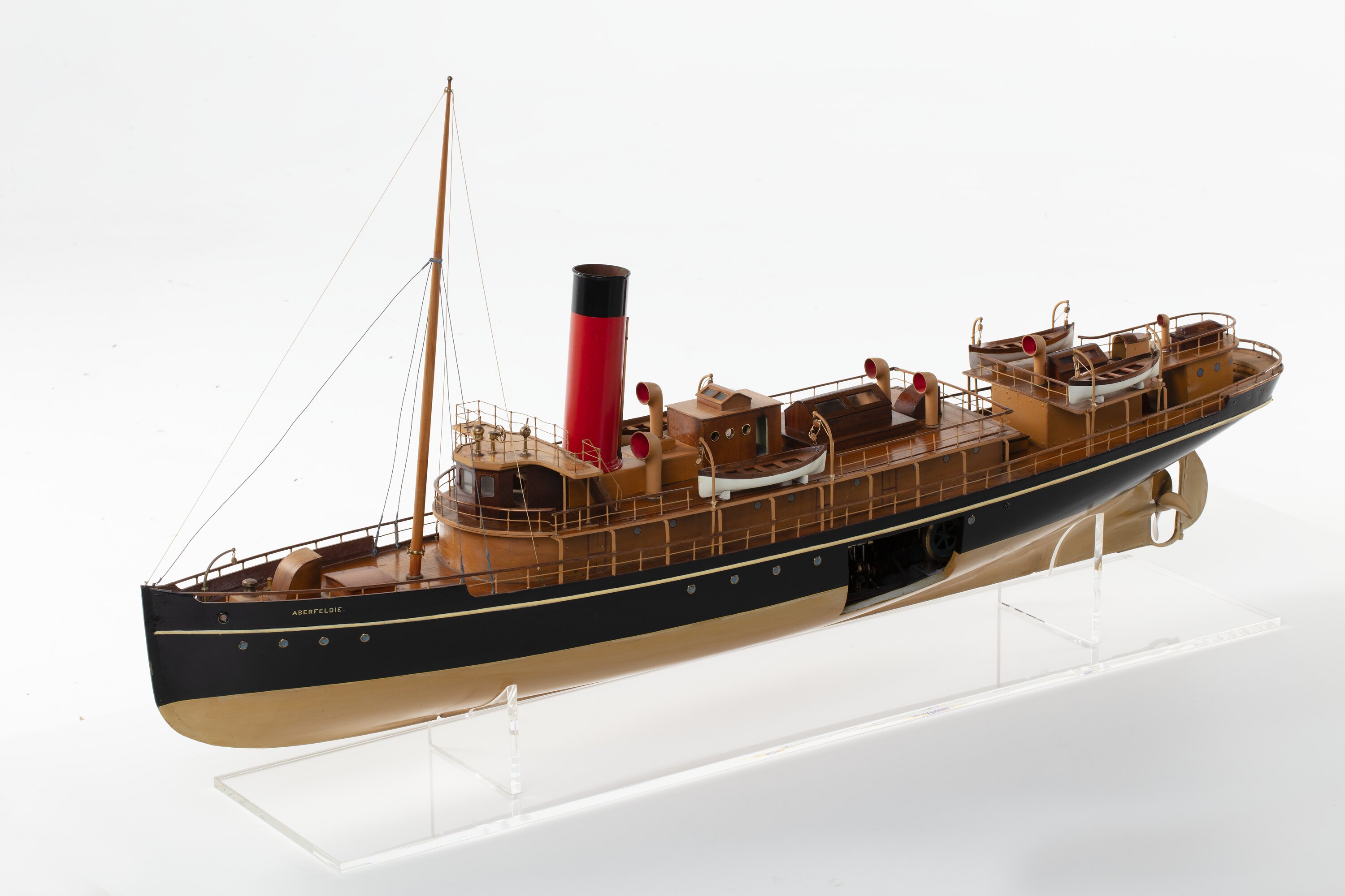 Model of the passenger steam ship SS Aberfeldie made by Mr A. E.Smith about 1918. The model dimensions l 4.2 ft., beam 8.75 in. Fitted with working engine.