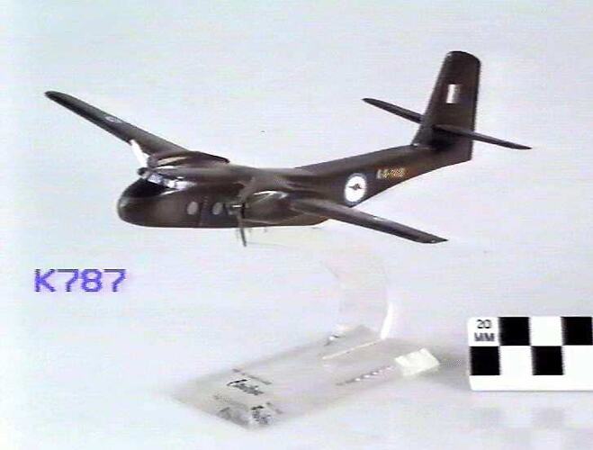 This model represents A4-140, one of the first group of Caribou aircraft delivered to the RAAF in 1964. It served in Vietnam with 35 Squadron between 1968 and 1971. In 1975 it was sent to East Timor where it was hijacked and the pilots forced to fly refugees to Darwin. It also served in Bougainville and again in East Timor with INTERFET. It is the longest serving RAAF aircraft, flying with 38 Squadron. A4-140 was delivered to the Australian War Memorial in late 2009. This model is painted in all-over dark green used until the 1980s. It is believed to be a factory model produced by DHC for display or promotional use and is mounted on a perspex display stand.