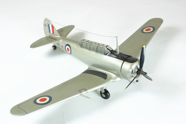 This 1:30 scale model was donated to the Museum in 1954 by the Commonwealth Aircraft Corporation. It was apparently built for display or promotional services and is finished in a post-war silver paint scheme representing A20-302. This aircraft served with No. 7 Service Flying Training School at Deniliquin between 1941 and 1945.