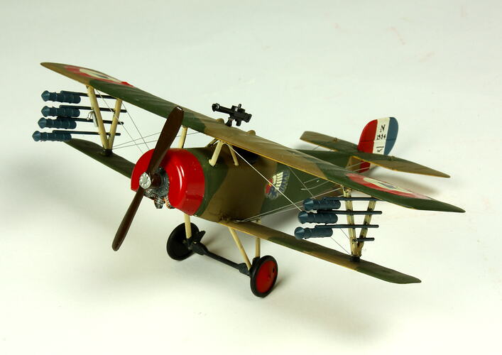 Scale model of a First World War Nieuport 16 biplane fighter aircraft. This model is painted to represent aircraft serial no. N1354.