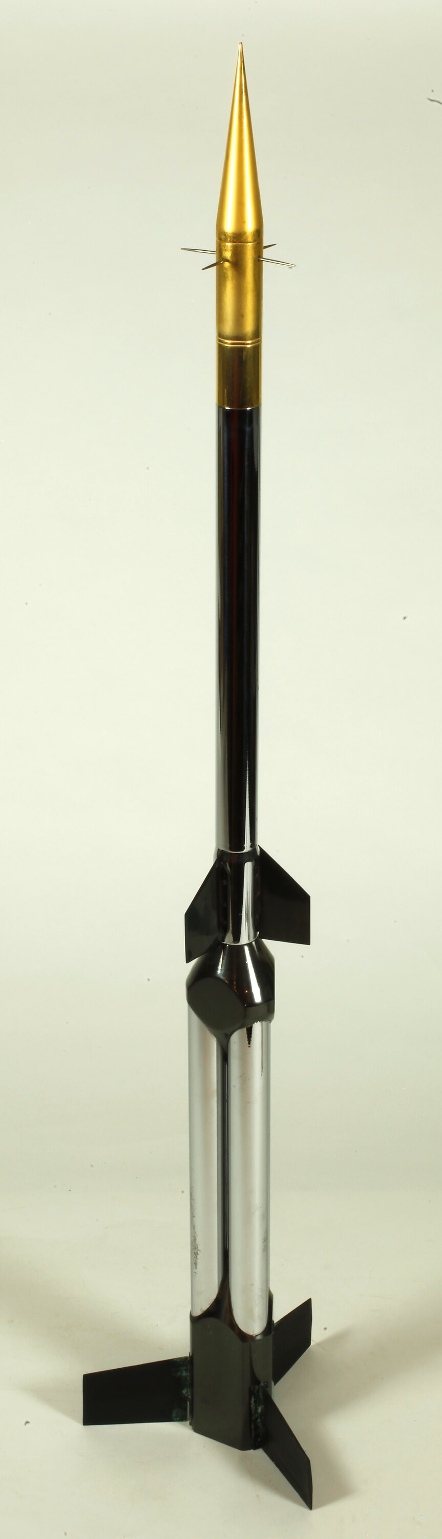 This scale model of a Long Tom research rocket was made by the Museum in 1962, from plans provided by the Department of Supply.