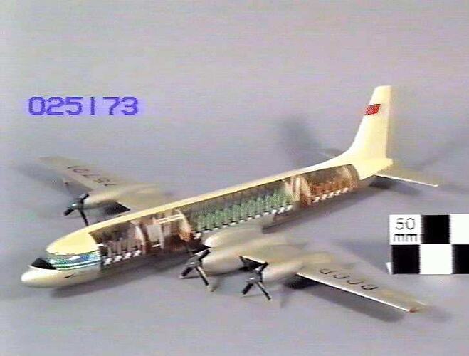 This 1:35 scale sectioned model of an Il-18 airliner in Aeroflot markings was donated to the Museum in 1961 by the Union of Soviet Socialist Republics Polytechnical Museum in Moscow.