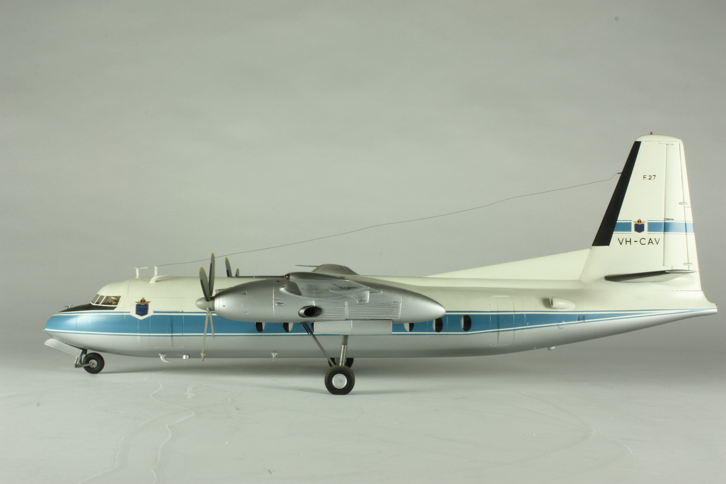 A 1:48 scale model built for the Museum under contract by Mr R.D Ramsay in 1966. The model is painted to represent VH-CAV, a Friendship F27-1009 serial number 10131 operated by the Department of Civil Aviation. On 23 March 1962, this aircraft carried the pre-production prototype of the Aeronautical Research Laboratory (ARL) flight data recorder on its first test flight. The Friendship departed from Essendon Airport in Melbourne and conducted a series of handling tests which were traced successfully on a wire recorder. This aircraft was later flown by Air-UK in Britain as G-STAN.