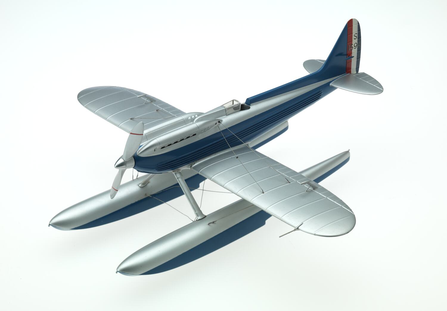 Plastic model aeroplane painted silver and blue with propeller at front and two large skids for landing on water.