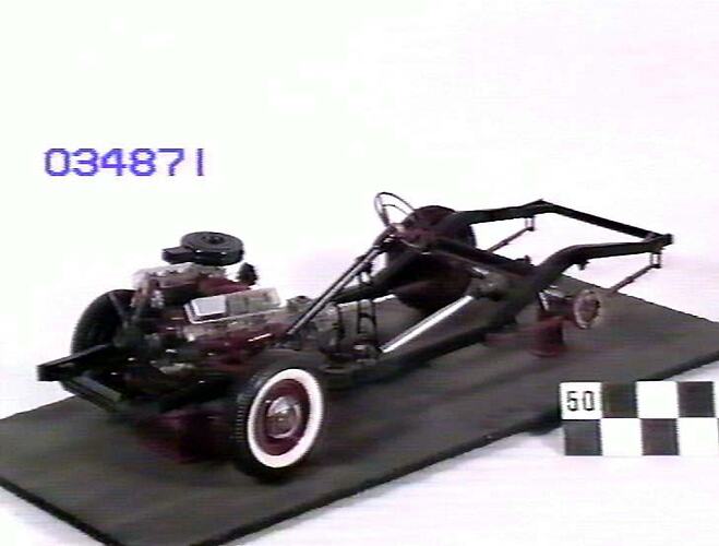 This chassis model is apparently based on a Dodge or Chrysler motor car from the 1950s features a V8 engine and three-speed manual gearbox. The model is made by Renwal Products Inc, New York who produced this kit as the "Visible Automobile Chassis' in the 1960s. A kit for the 'Visible V8' engine was sold separately and could be fitted on the chassis. The model is mounted on a black painted wooden display base.