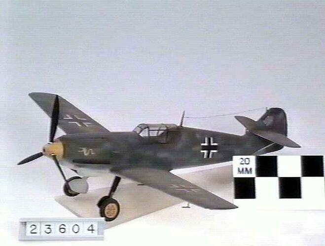 Scale model, 1:36, of a Messerschmitt Bf 109E, built by R.D. Ramsay under contract to Museum Victoria. It was completed and delivered in 1954.