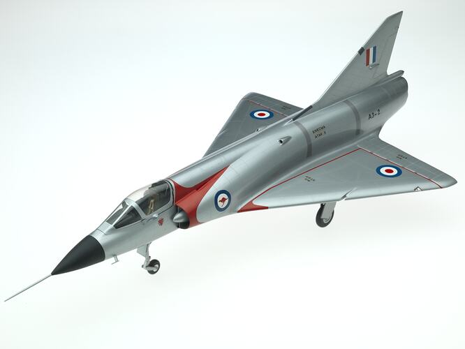This 1:32 scale model of a RAAF Mirage IIIO was built for the Museum under contract by Mr R.D Ramsay and was received in 1965. It is painted in the initial RAAF silver finish, which was later replaced by camouflage.