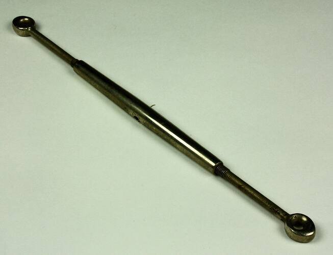 Metal double-threaded long turnbuckle (or turn buckle) designed for tightening diagonal bracing wires or stays on early wooden-framed aircraft. Associated with a Sopwith type biplane built by the donor's son Basil Watson, in July-October 1916.