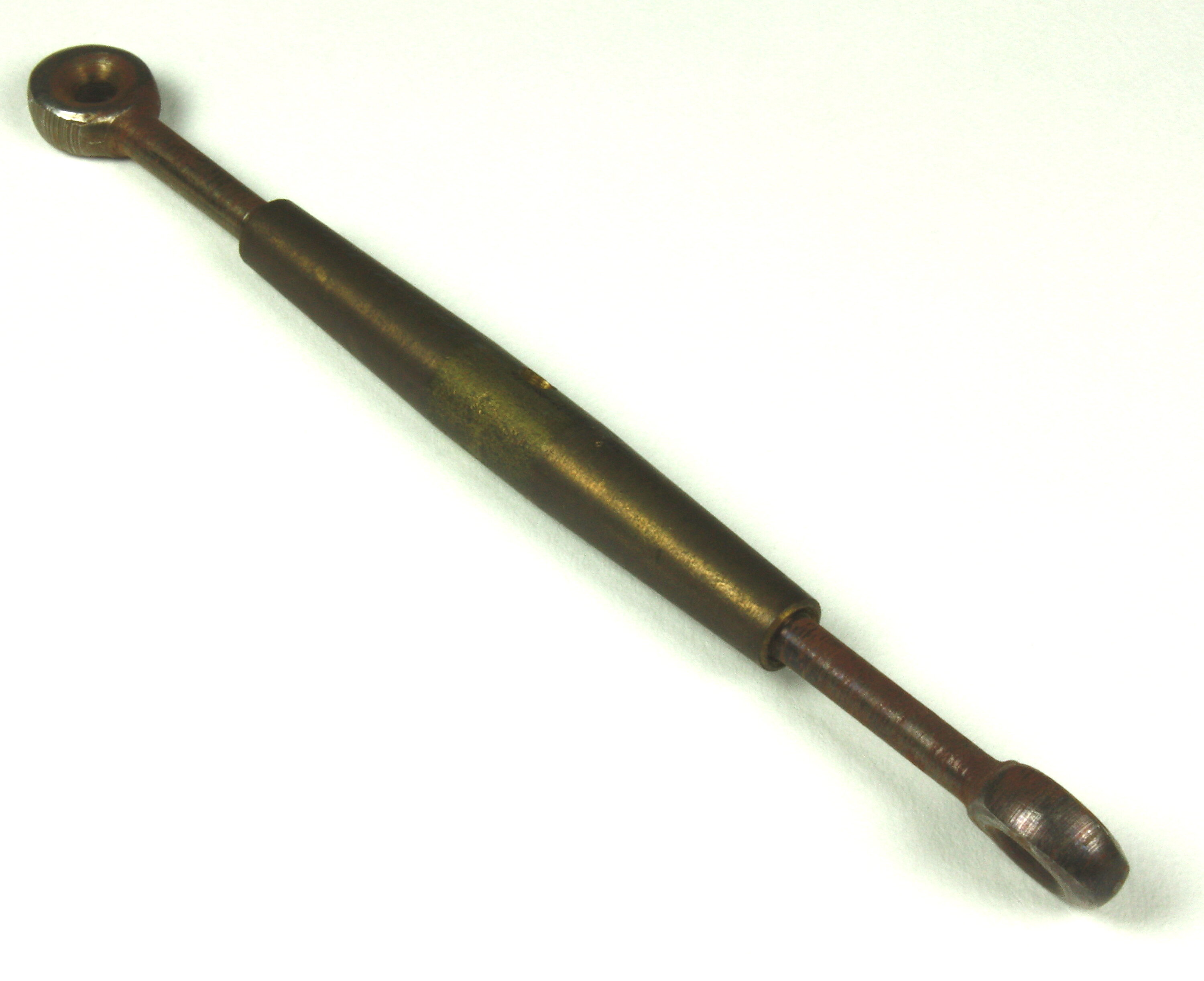 Metal double-threaded long turnbuckle (or turn buckle) designed for tightening diagonal bracing wires or stays on early wooden-framed aircraft. Associated with a Sopwith type biplane built by the donor's son Basil Watson, in July-October 1916.