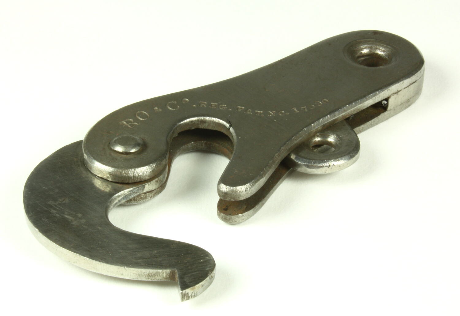 Steel shackle or releasing hook of a type used for dropping bombs from military aircraft during the early part of World War I. Markings on the part indicate that it was manufactured by Rubery, Owen & Co, of Darlaston, South Staffordshire, England, to a registered patent design. The hook was associated with the donor's son, Basil Watson, who built a Sopwith type single-seat biplane, in July-October 1916.