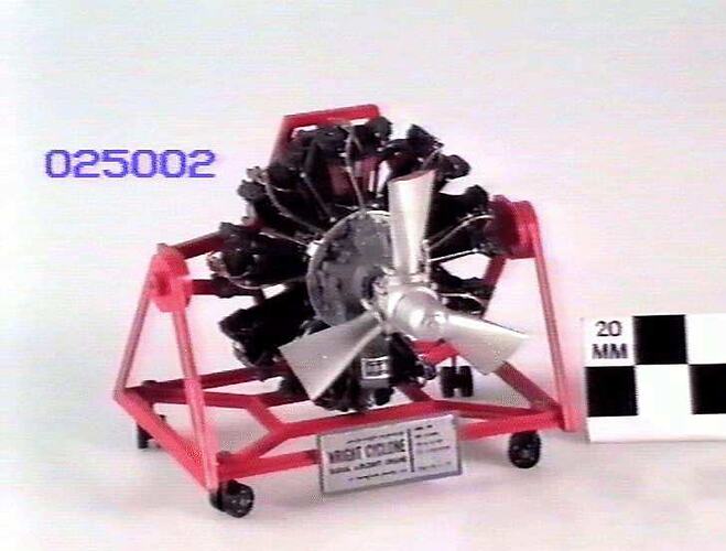 1:12 scale model of a Wright Cyclone R-1820-C9HE engine, commissioned by the Museum of Victoria and built by Mr R.D. Ramsay in 1960. It is mounted on a model servicing stand. It is believed to be made from a Monogram plastic model kit.