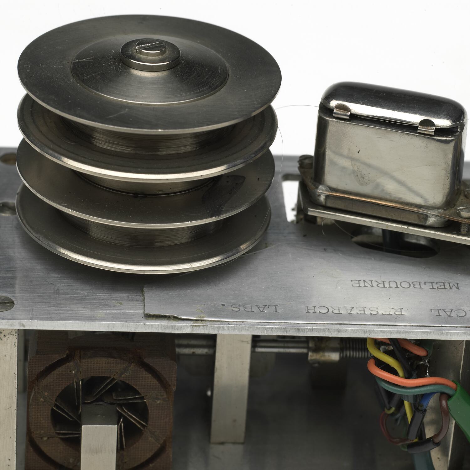On top of box: 'AERONAUTICAL RESEARCH LABS./MELBOURNE'. On top of blue plastic reel: 'Protono/minifon P55'.