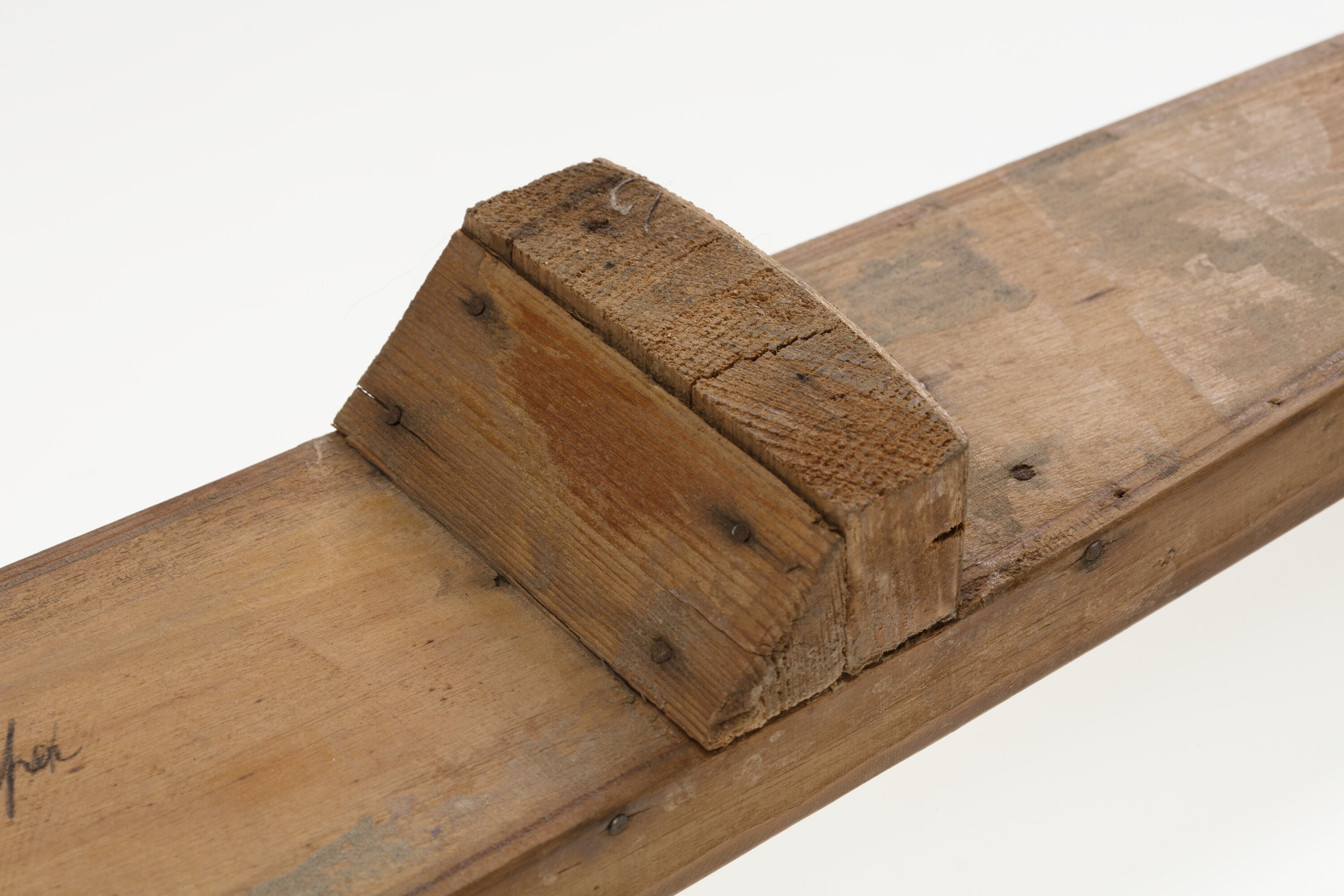 Wooden rib from the upper wing of a German Pfalz biplane. Consists of a 3-ply web with oval lightening holes and includes sections of two wing spars.